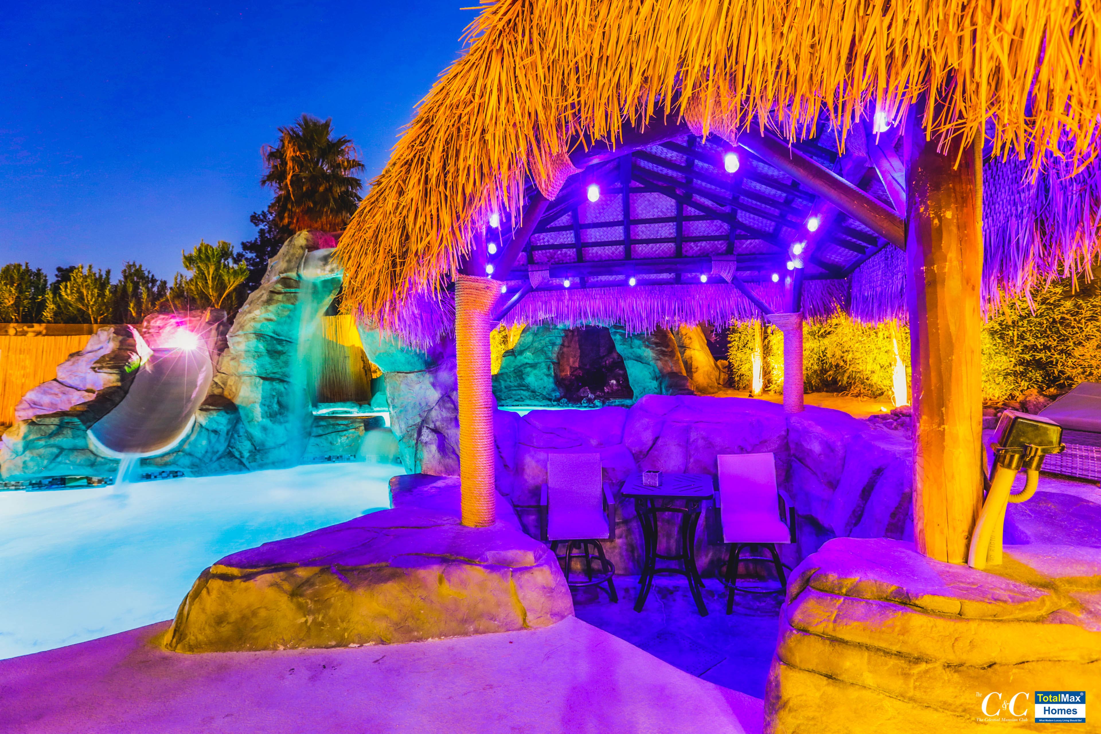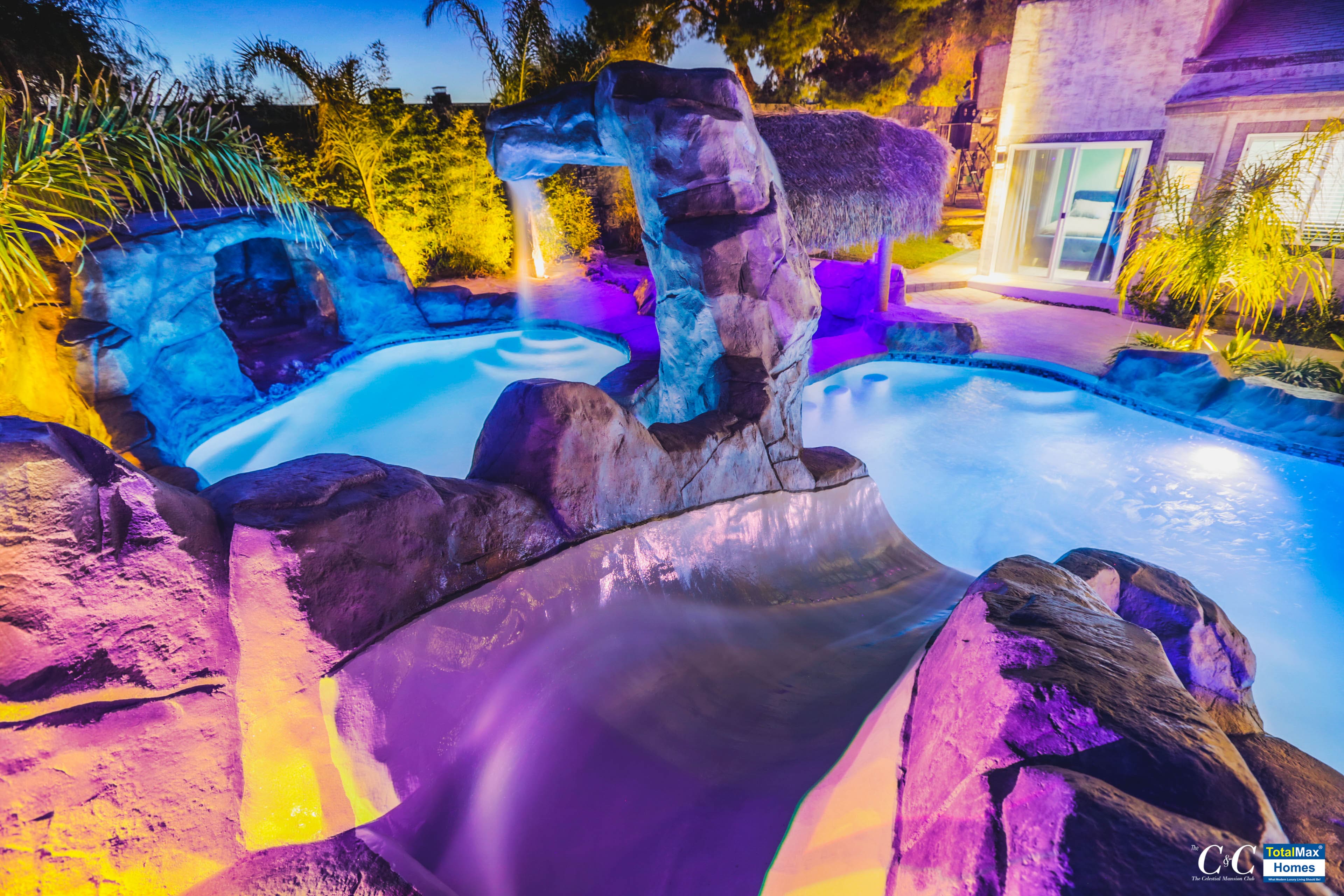 What’s there not to like? Everything is a blast! This amazing Mansion Club is fully equipped with 2 pools to choose from and either one can be heated. Enjoy a double waterfall, a slide for your youthful glee, a spa to relax your nerves, a swim-up bar for your favorite drink, a cave cabana and submersible bar stools and table.