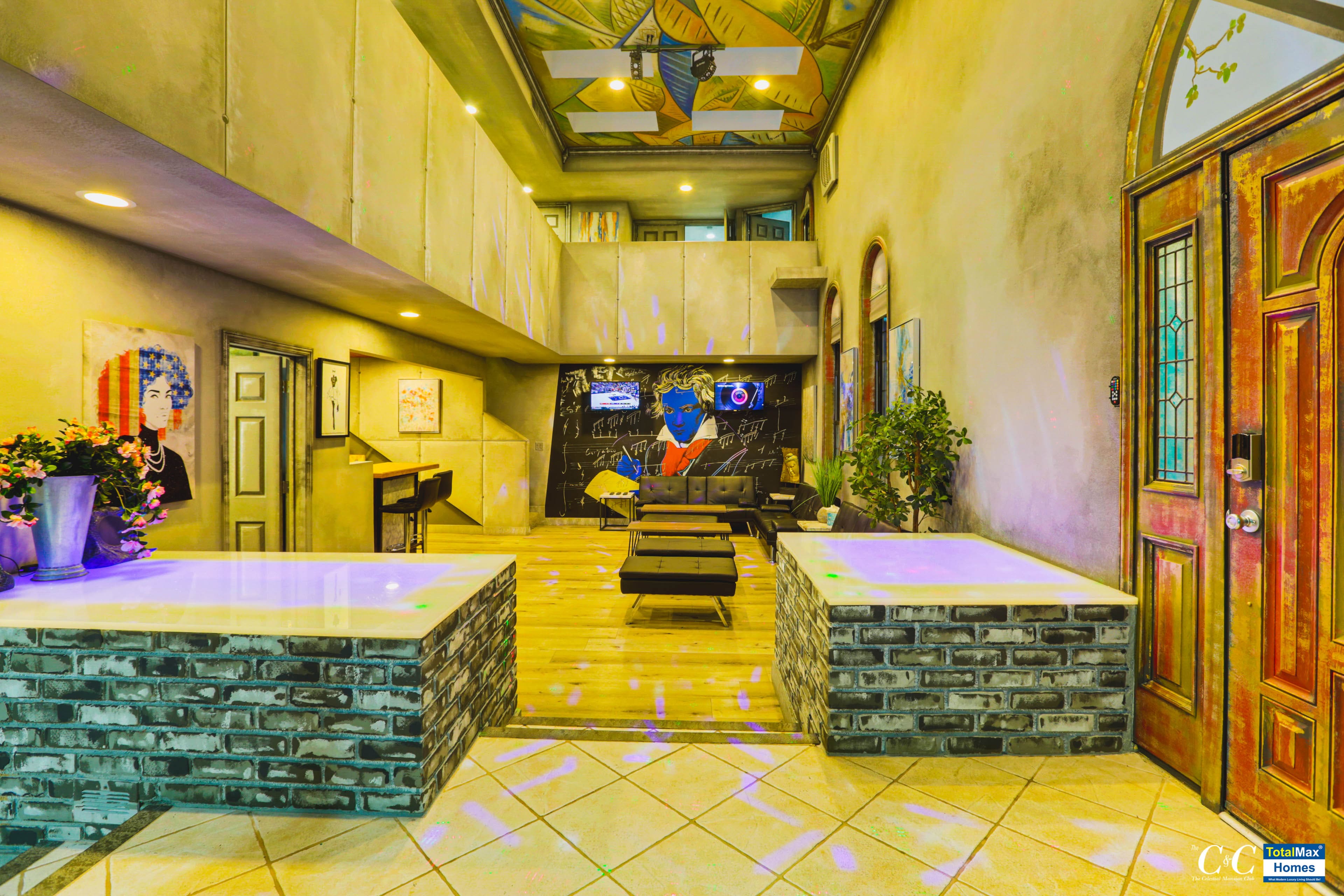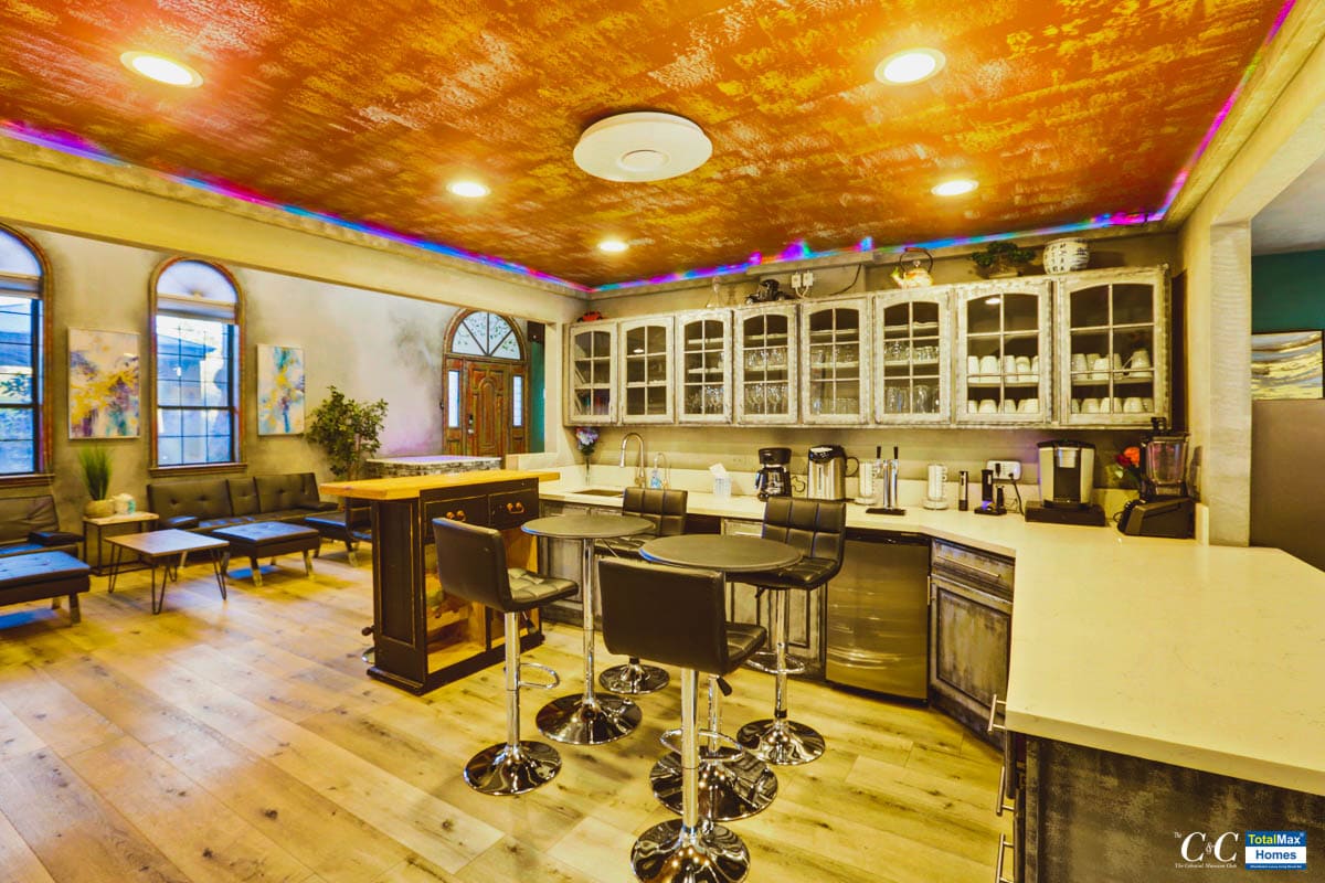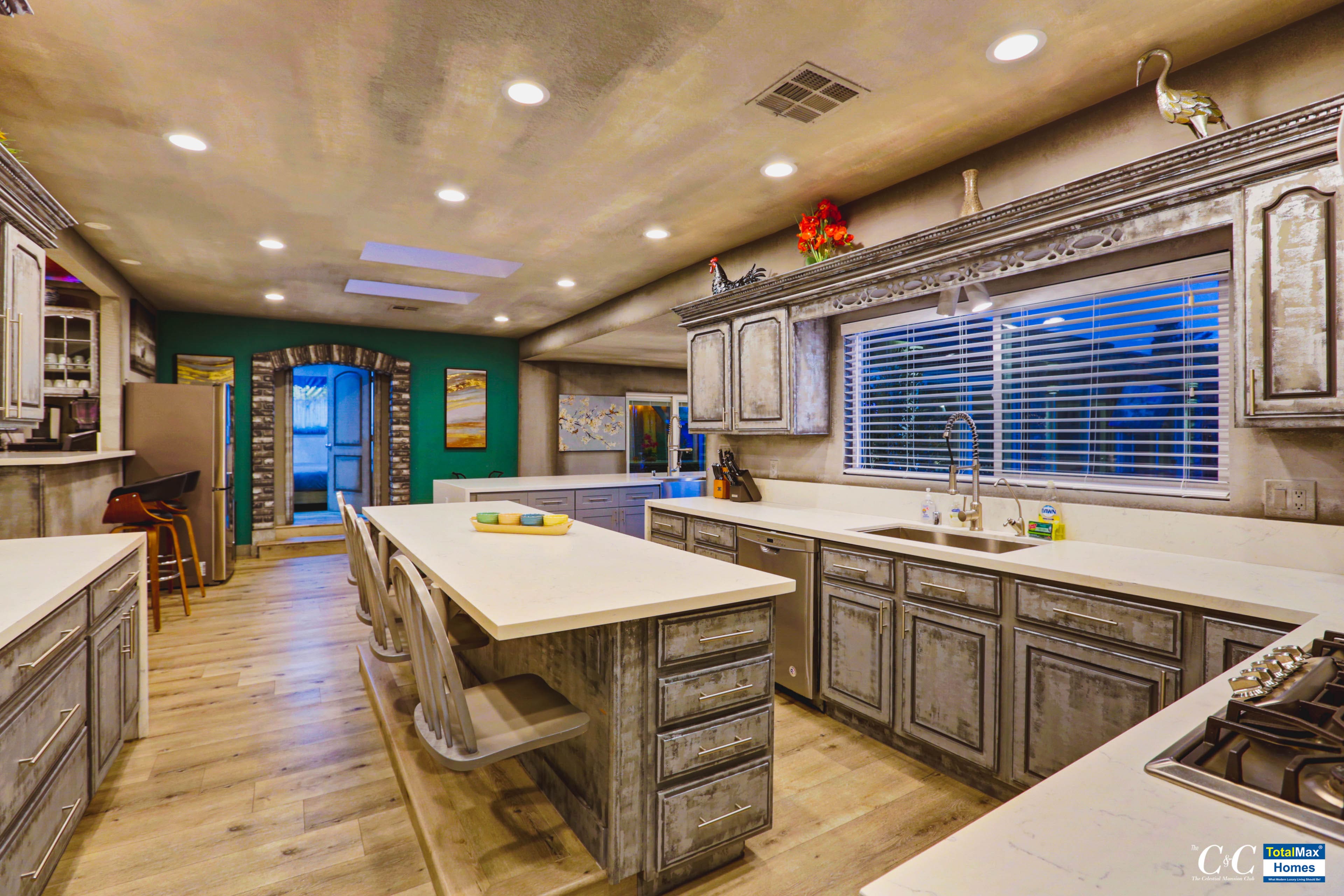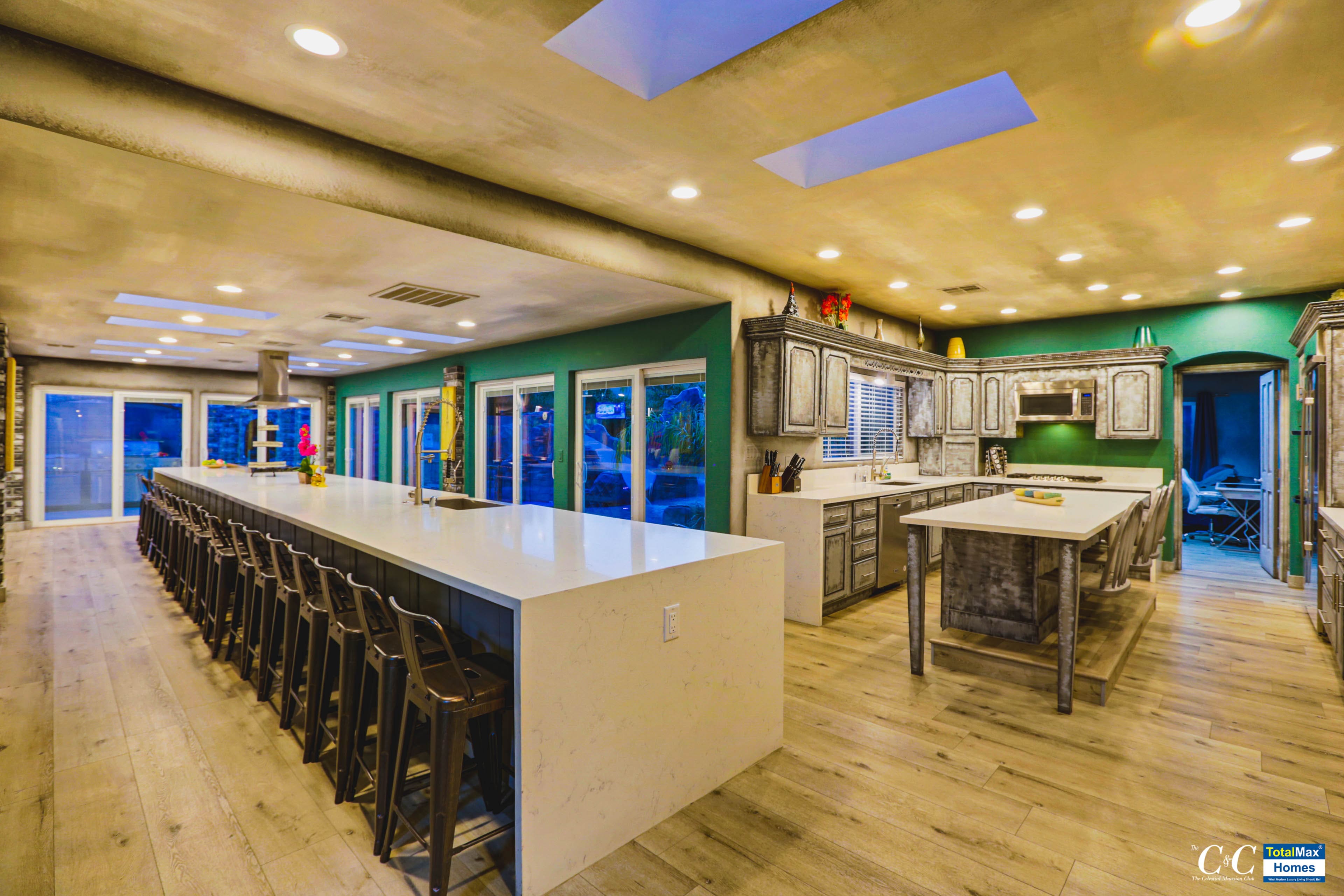 The kitchen boasts of brand new, high-end appliances: Ninja Blender, Keurig, InstaPot, electric hot water kettle, a few among the many. There are 4 ovens, 2 microwaves, a dozen stove tops inside and also multiple refrigerators, wine coolers, a double tap kegerator, ice machine and multiple sinks. If the indoor kitchen is amazing, so is the outdoor kitchen that features 5-burner BBQs, an industrial work burner, huge 20 chicken rotisserie and another 6-burner stove top.