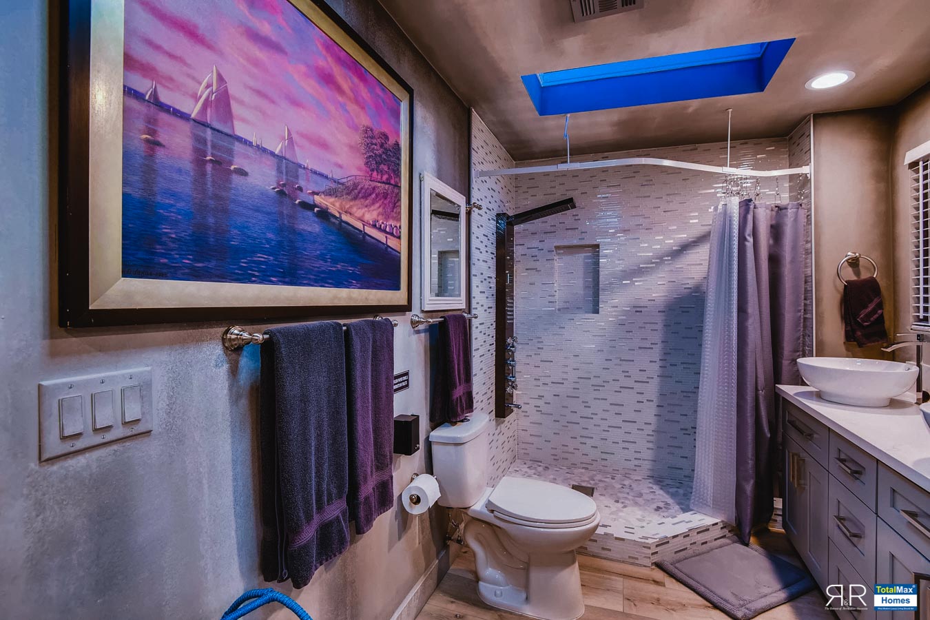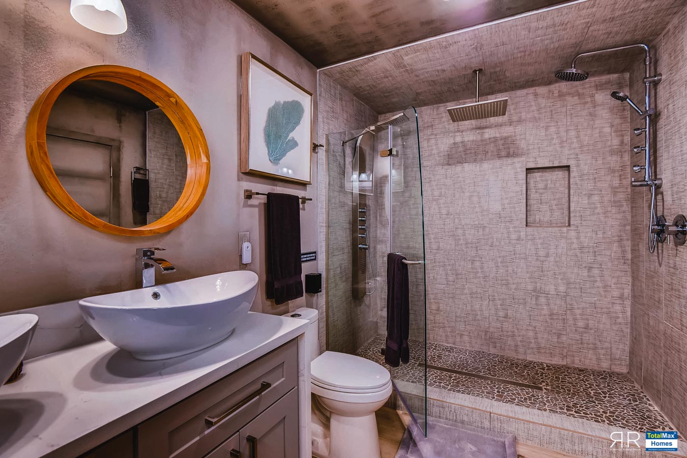 The European style master bathroom is fit for royalty with an enclosed shower in marble, limestone and pebble stone, a Swedish sauna for 4 guests, a marble counter double sink vanity and rain showers with massage systems.