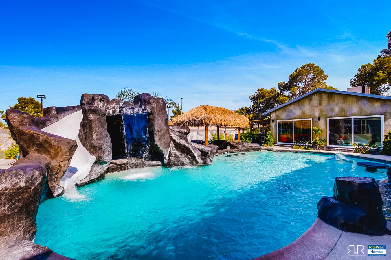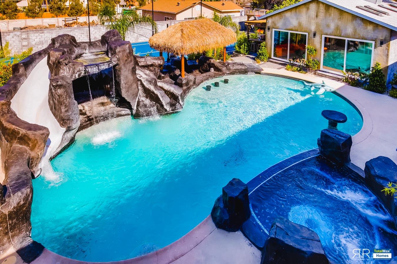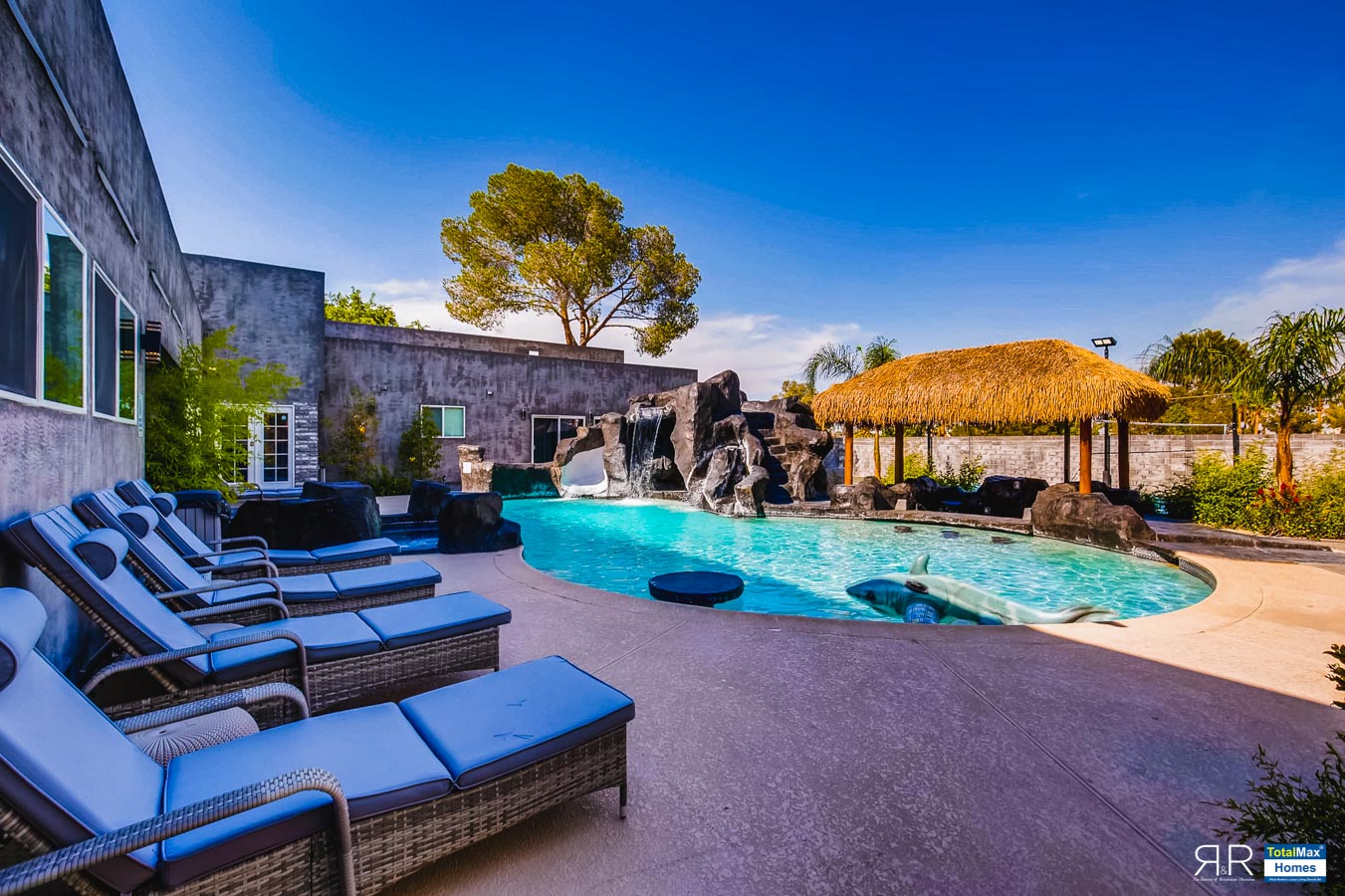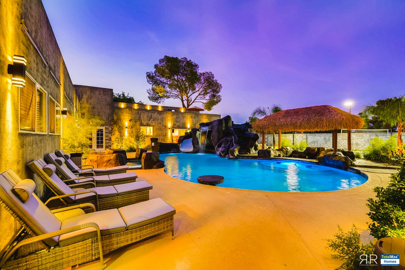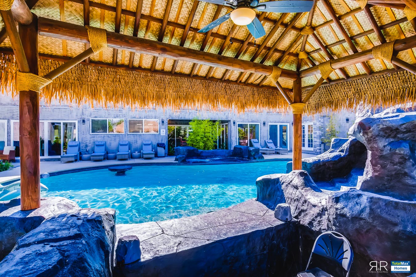 In fact, the outdoor features of the R & R Mansion are even to die for. Guests will be surprised at the backyard where there’s a huge resort pool that's more than 12-feet deep. It’s connected by waterfalls, a water slide, a grotto, swim-up bar, and Hawaiian style Palapa shades. A built-in fogger and misting jets make the pool area most ideal for a fresh splash.