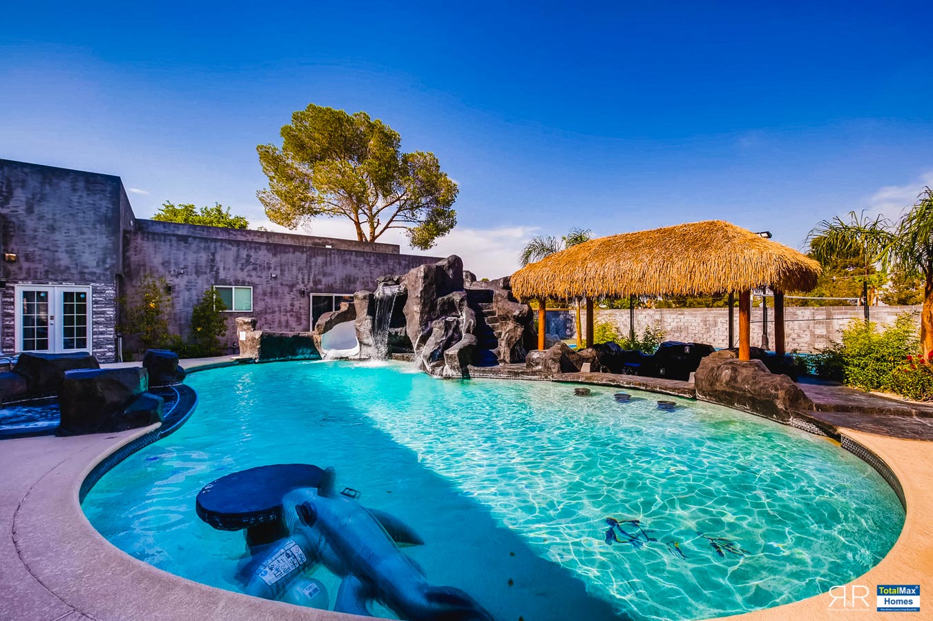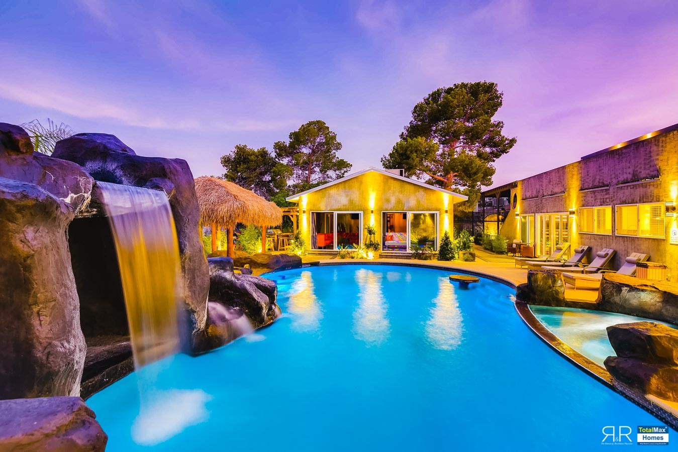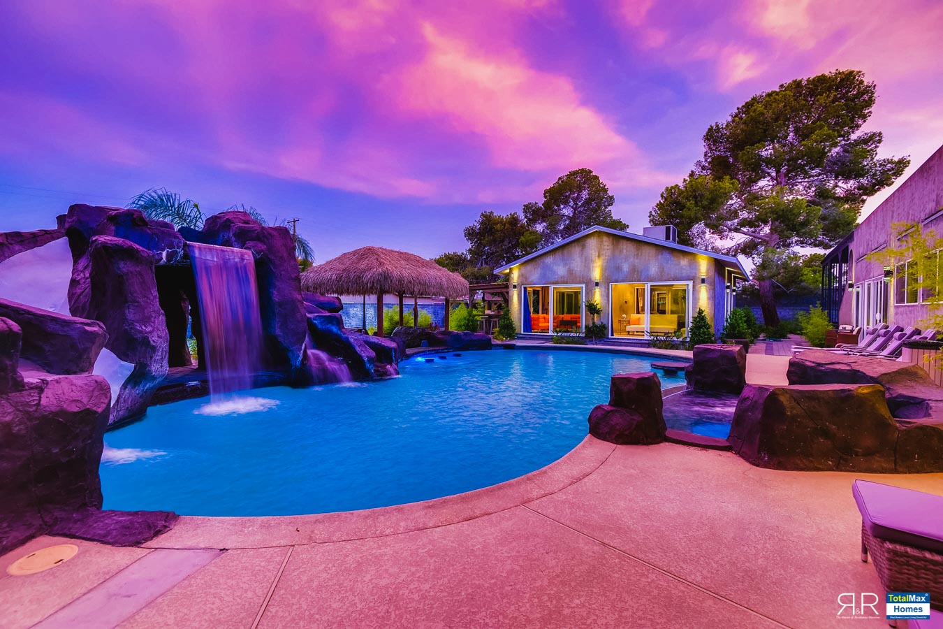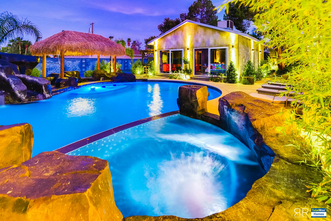 In fact, the outdoor features of the R & R Mansion are even to die for. Guests will be surprised at the backyard where there’s a huge resort pool that's more than 12-feet deep. It’s connected by waterfalls, a water slide, a grotto, swim-up bar, and Hawaiian style Palapa shades. A built-in fogger and misting jets make the pool area most ideal for a fresh splash.