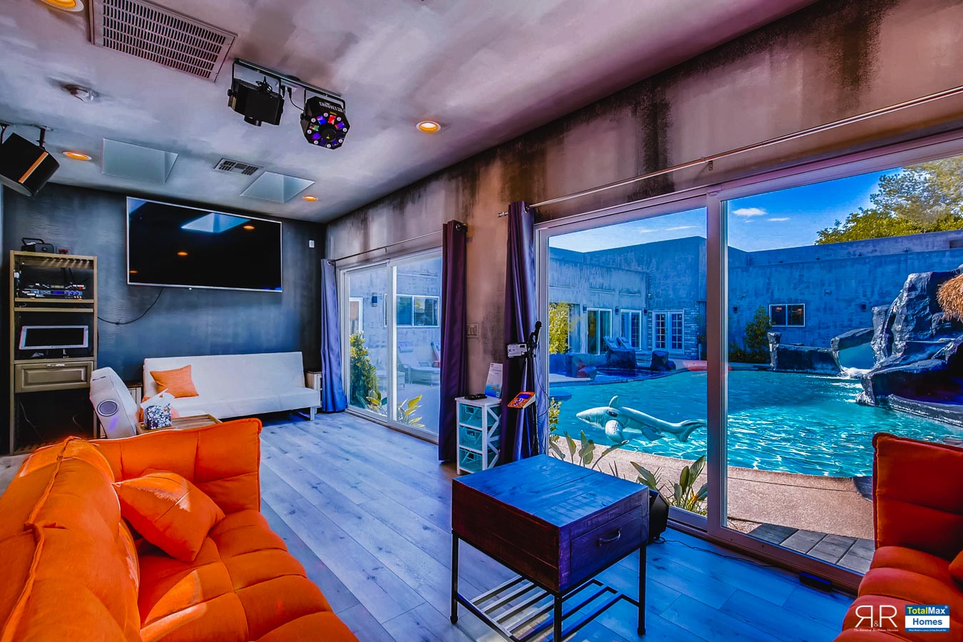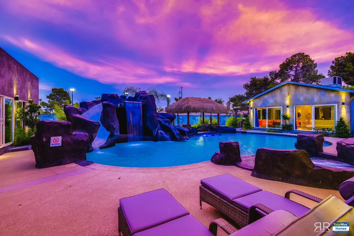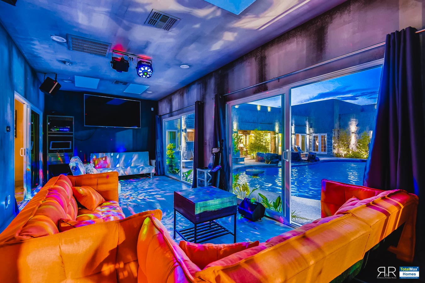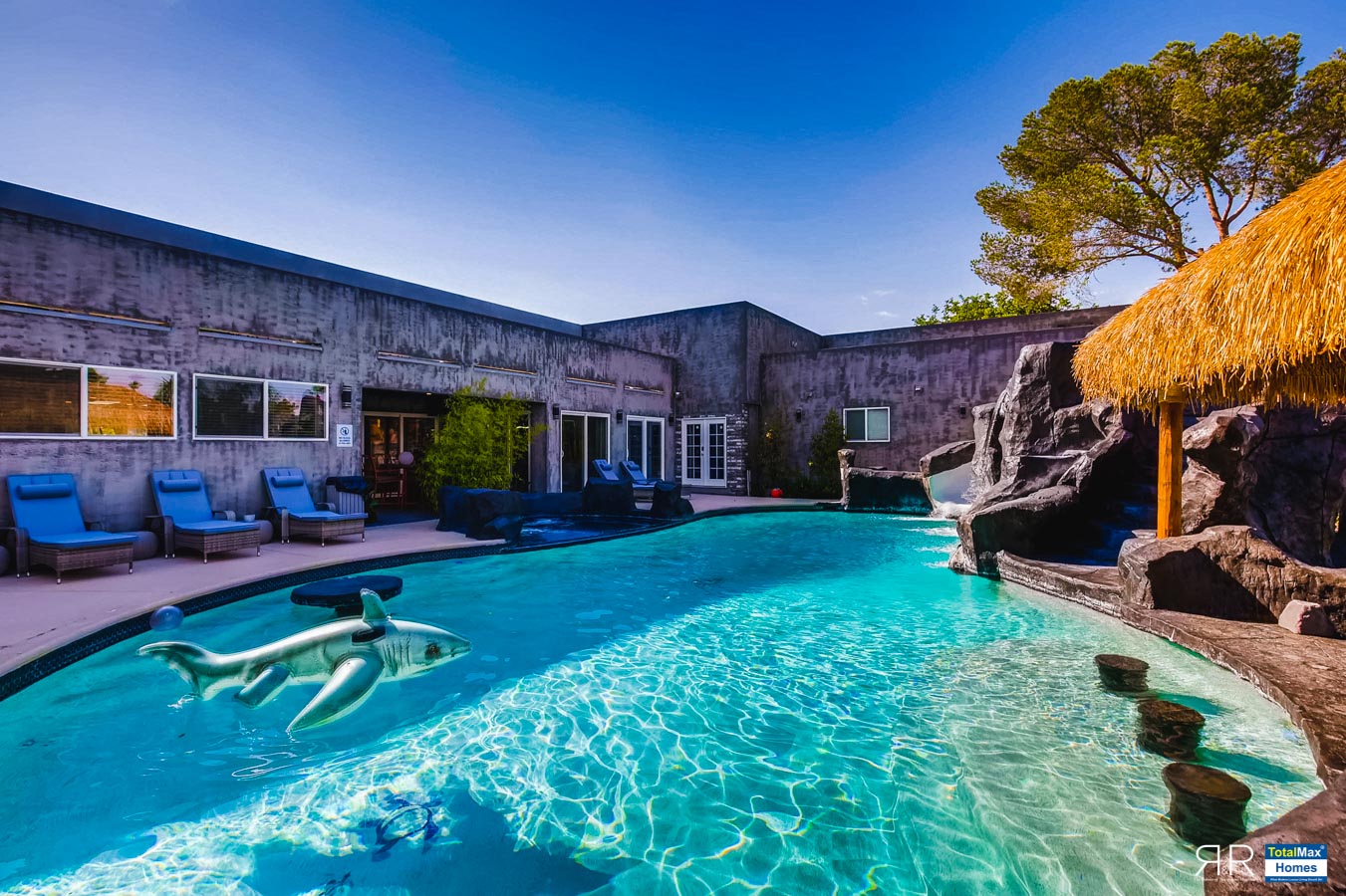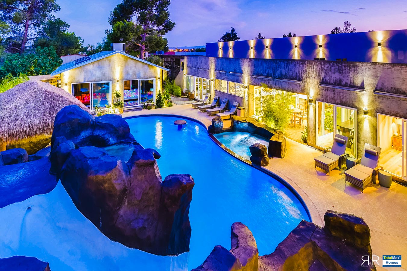 In fact, the outdoor features of the R & R Mansion are even to die for. Guests will be surprised at the backyard where there’s a huge resort pool that's more than 12-feet deep. It’s connected by waterfalls, a water slide, a grotto, swim-up bar, and Hawaiian style Palapa shades. A built-in fogger and misting jets make the pool area most ideal for a fresh splash.