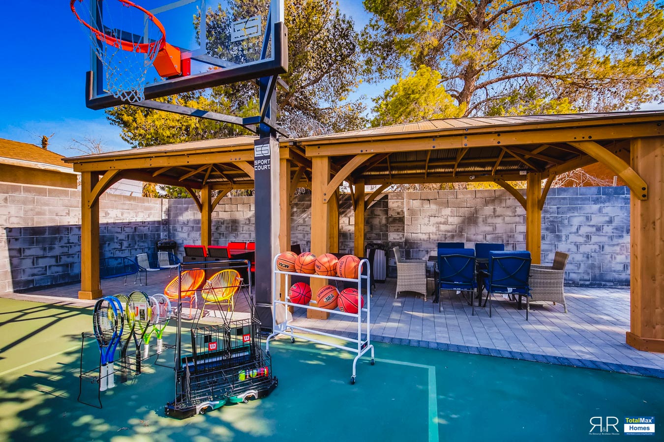 Then for sports buffs, next to the pool, is a full basketball court built by one of the top sports court builders in the USA, and one of the few available amenities here in Vegas for sports-minded guests. Basketball teams come here for the NBA Summer league, NCAA games, including hundreds of teams for basketball camps.
