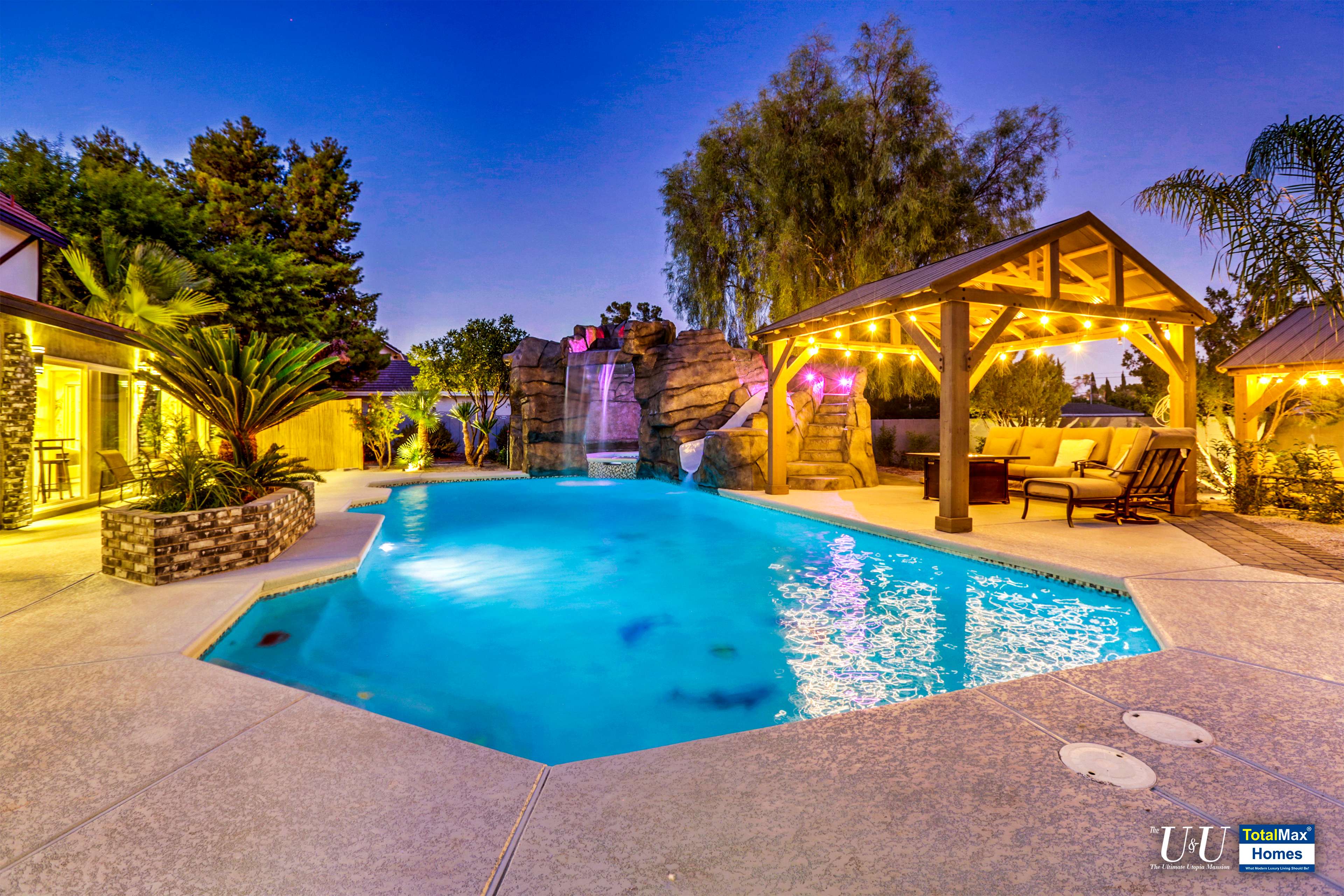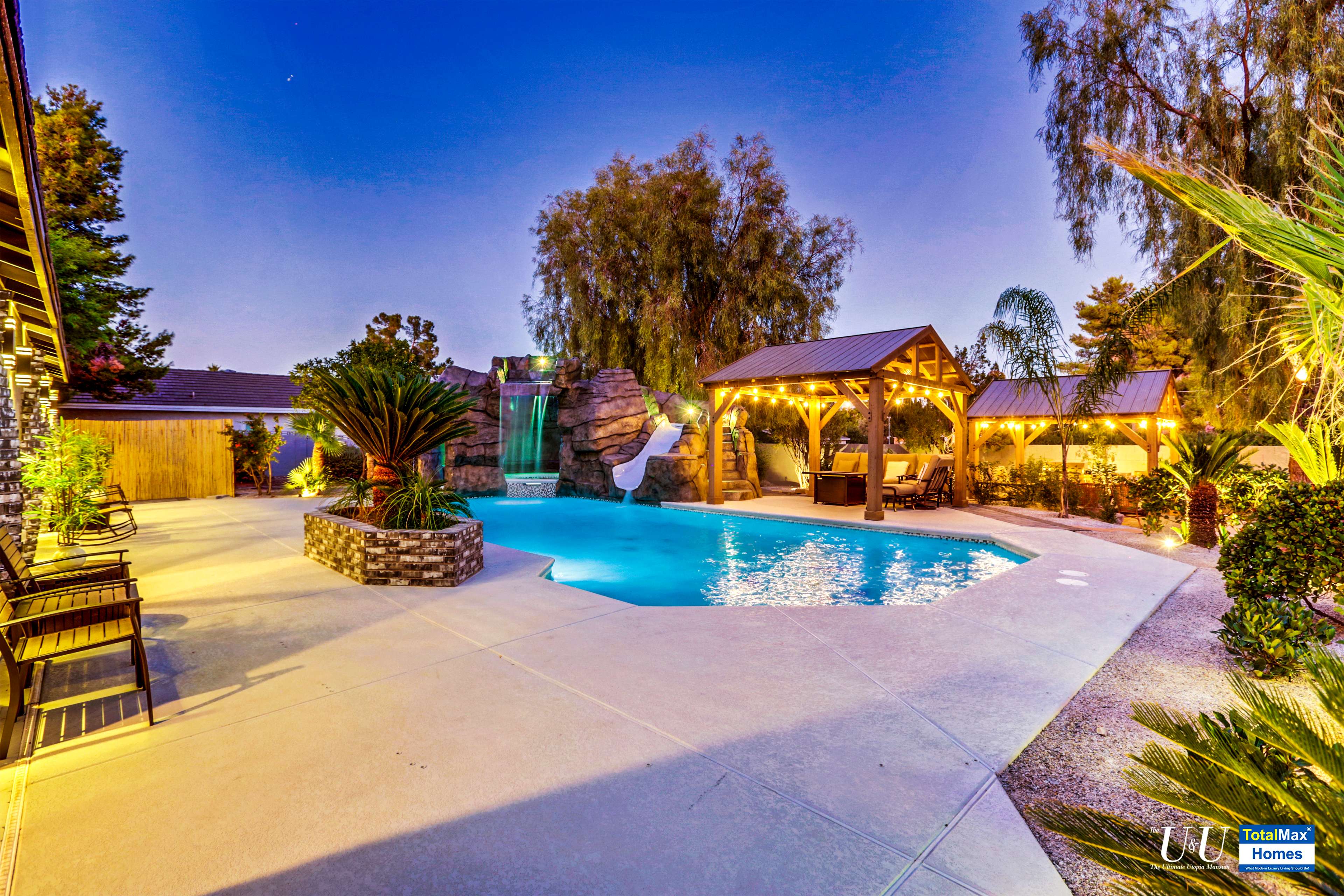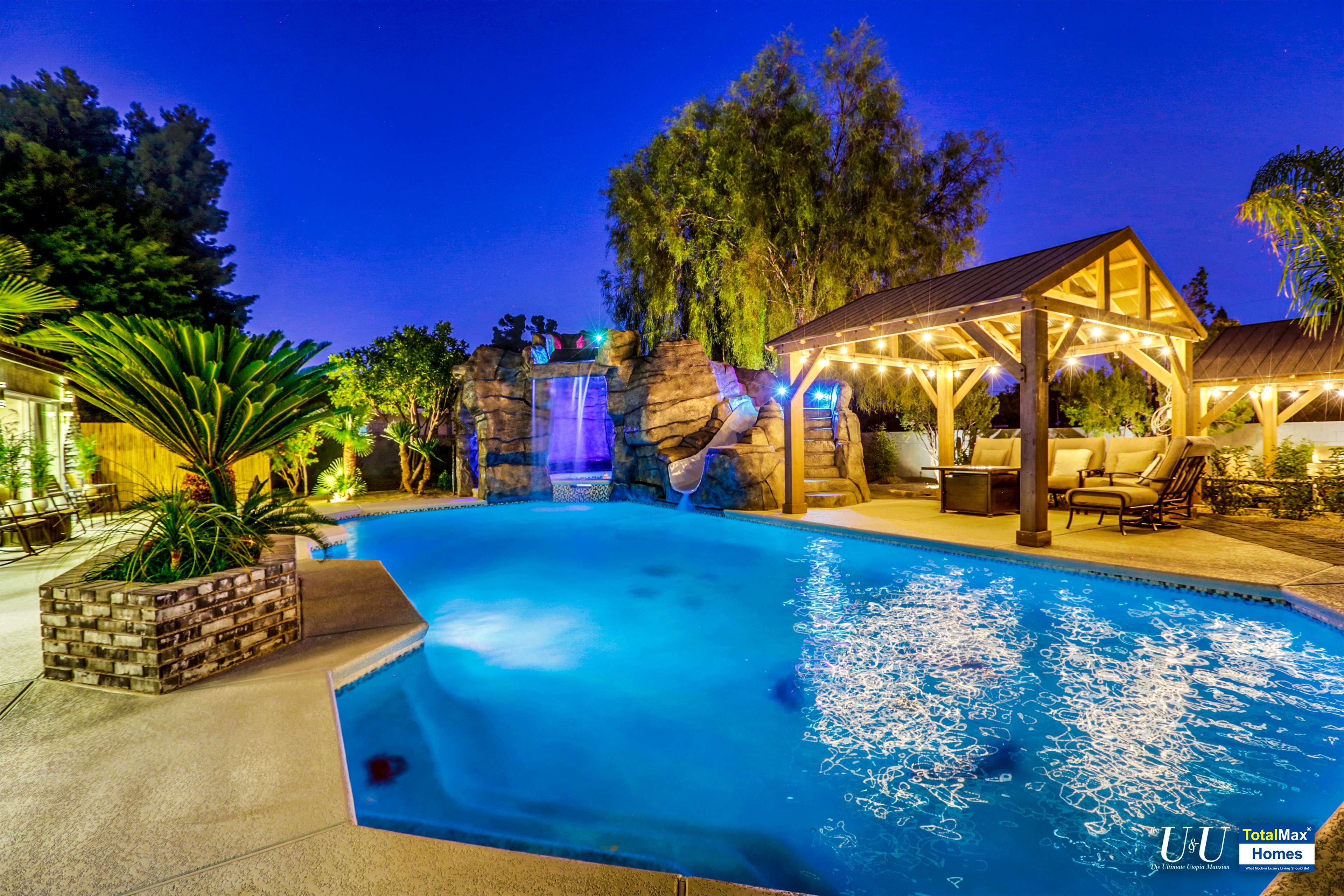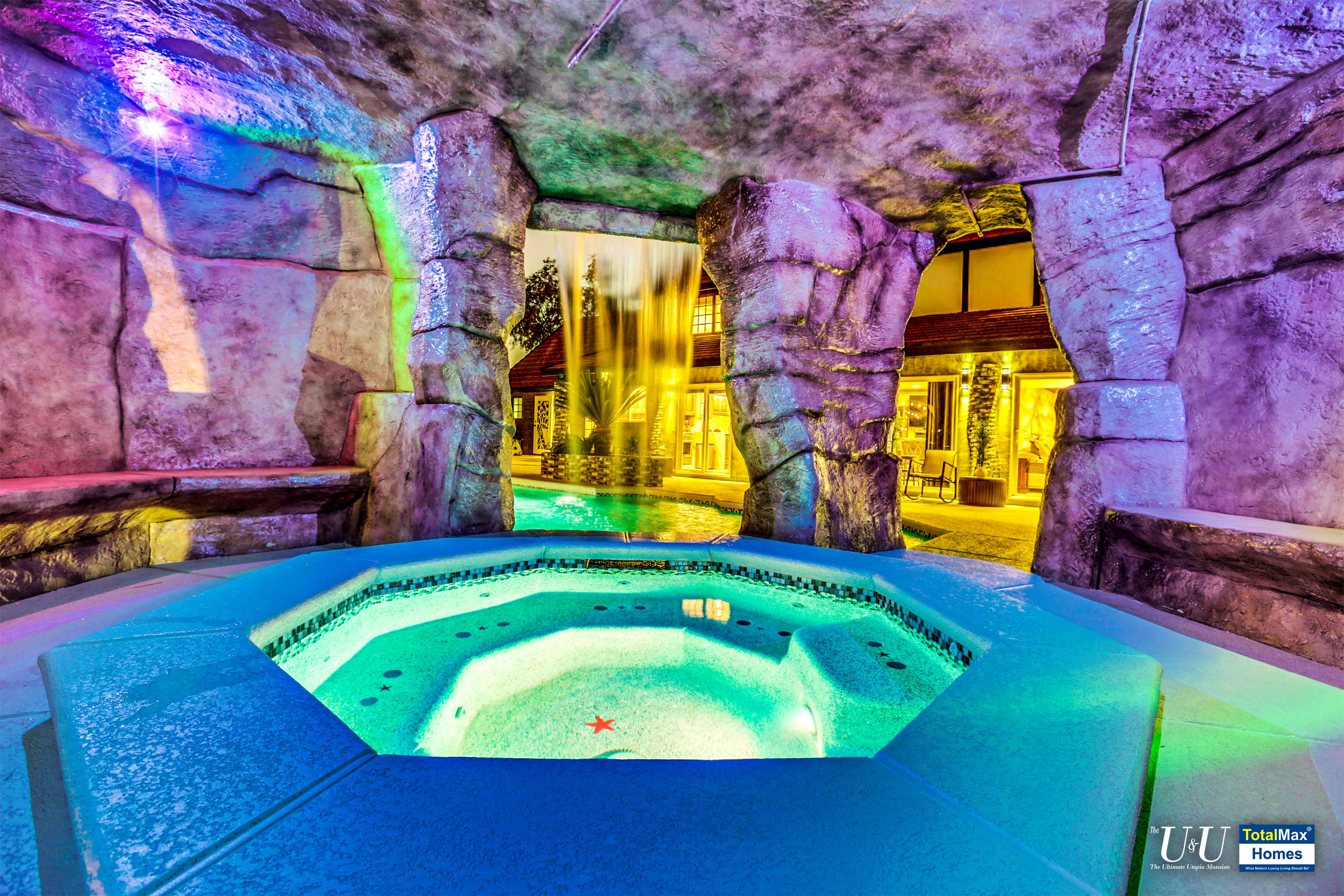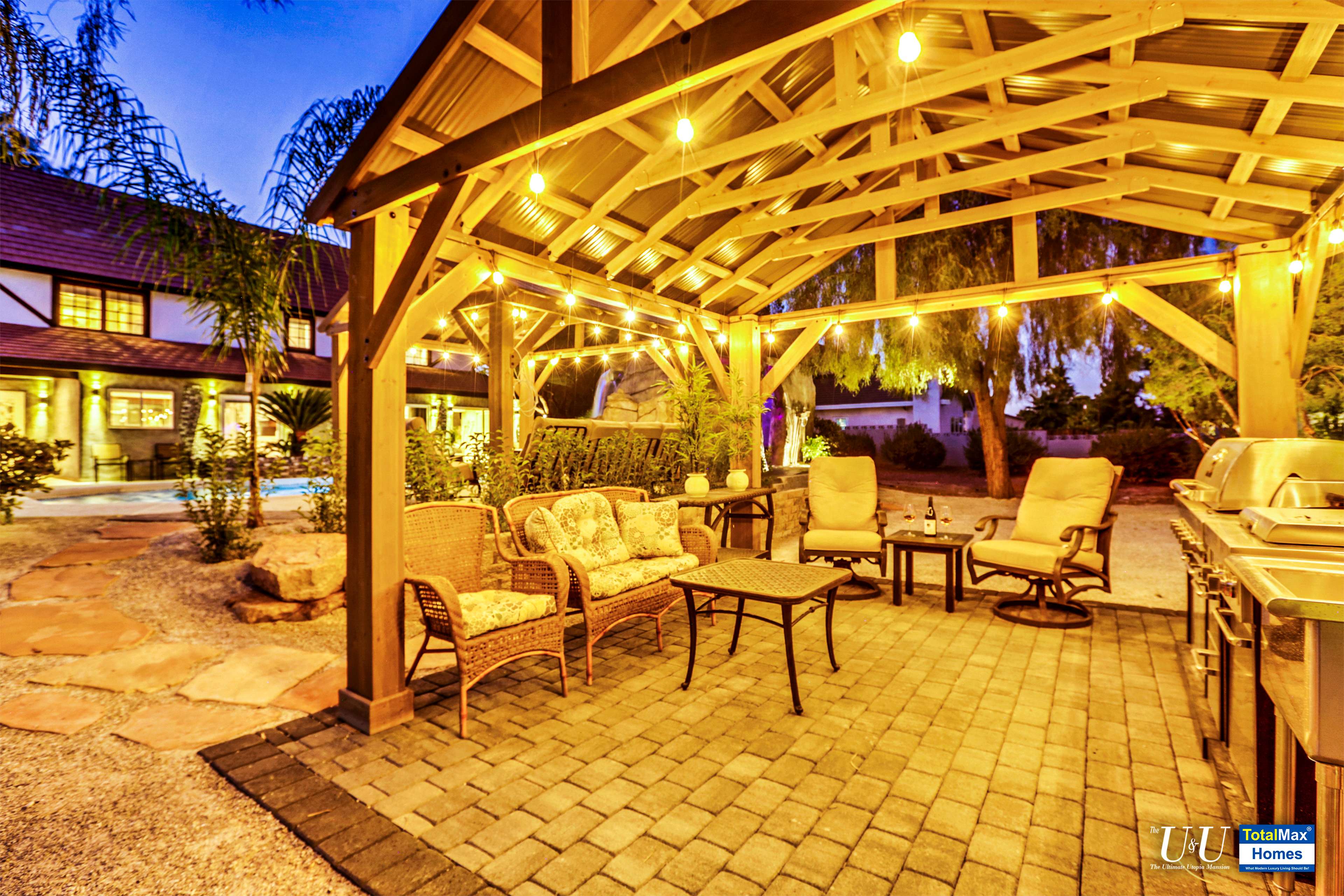 Cascading waterfall flows above the cave into the sparkling, large resort pool. Beat the heat with The O Zen swim up bar with submersible stools and table---just like you are at a 5 start beach resort pool. Fun for all: enjoy more recreation with a game of basketball. Complete outdoor kitchen, not just an Barbecue island----two burners, large hot plate, water w/sink, refrigerator, and a large barbecue stove. Connected the Spa and bamboo/palm trees lined grass backyard, comes another relaxing outdoor lounge area under a Gazebo.