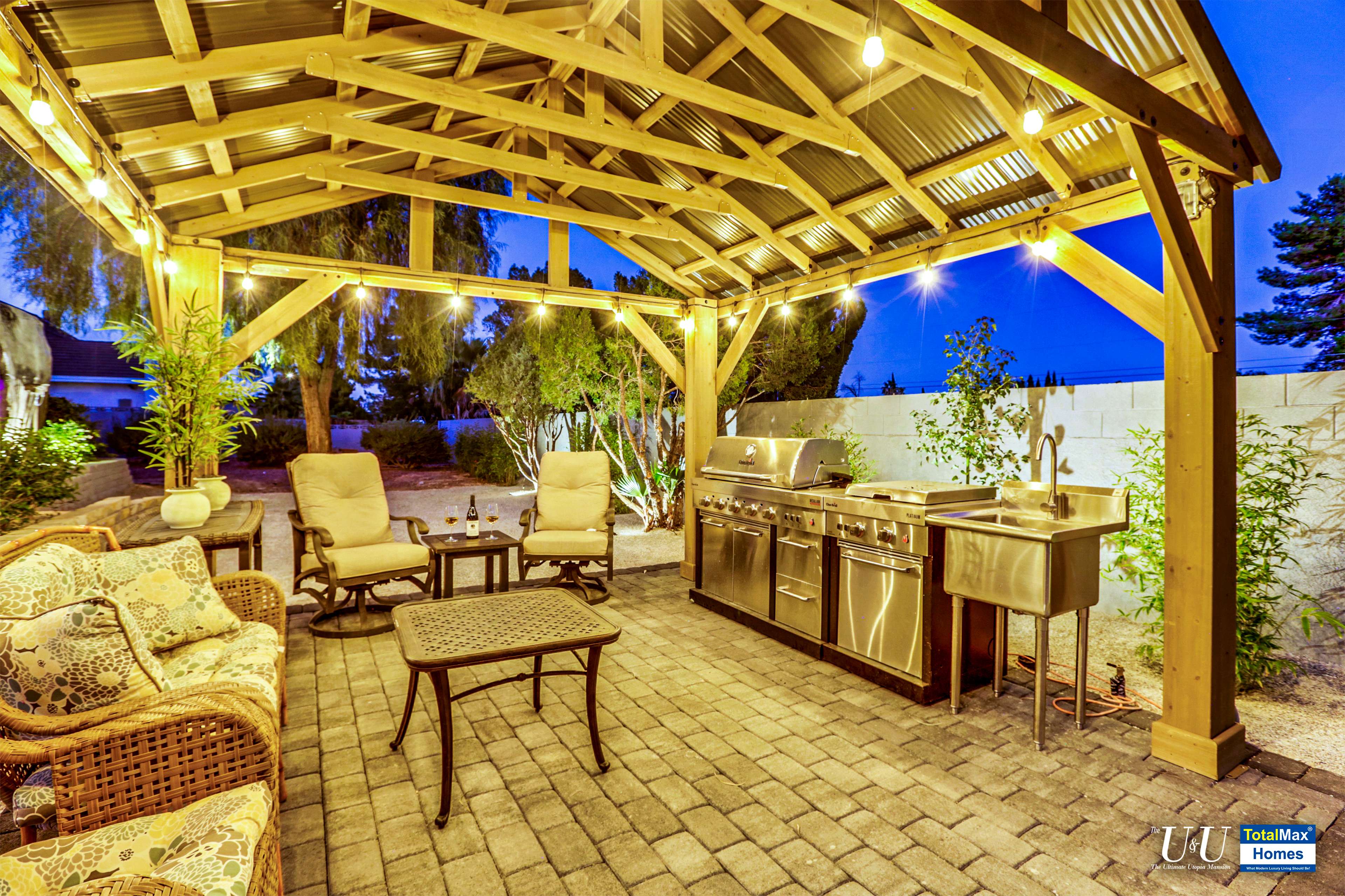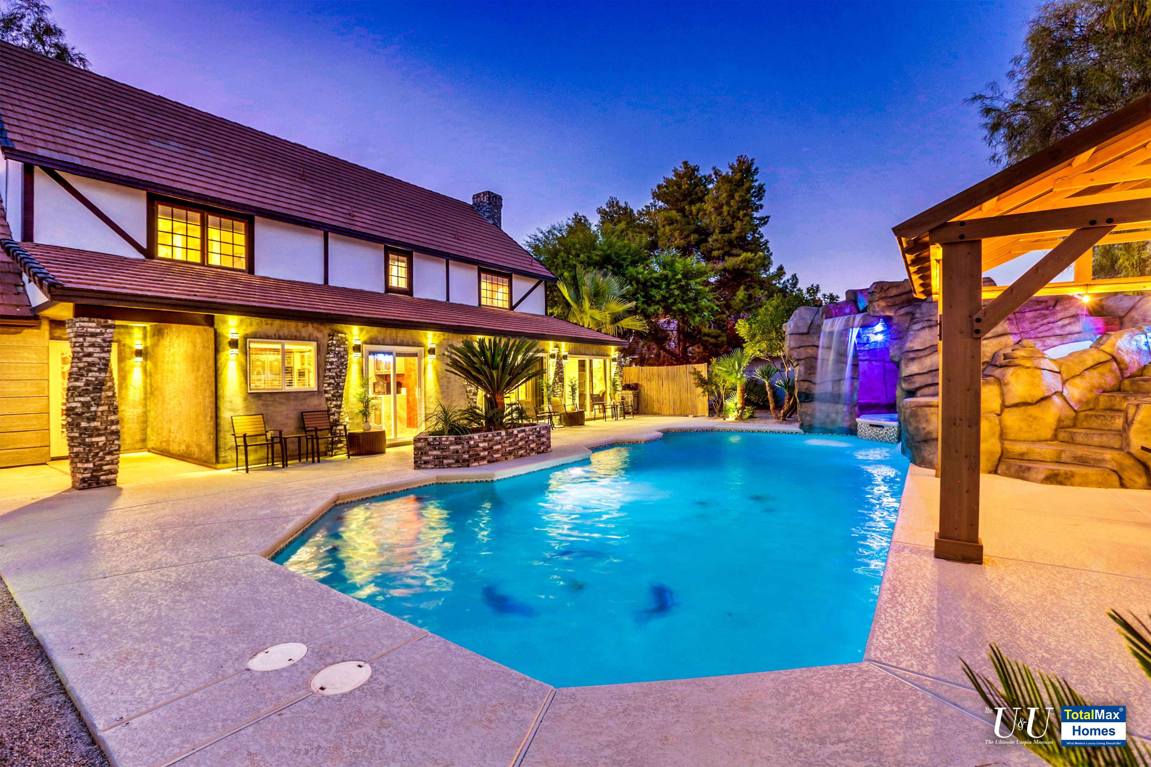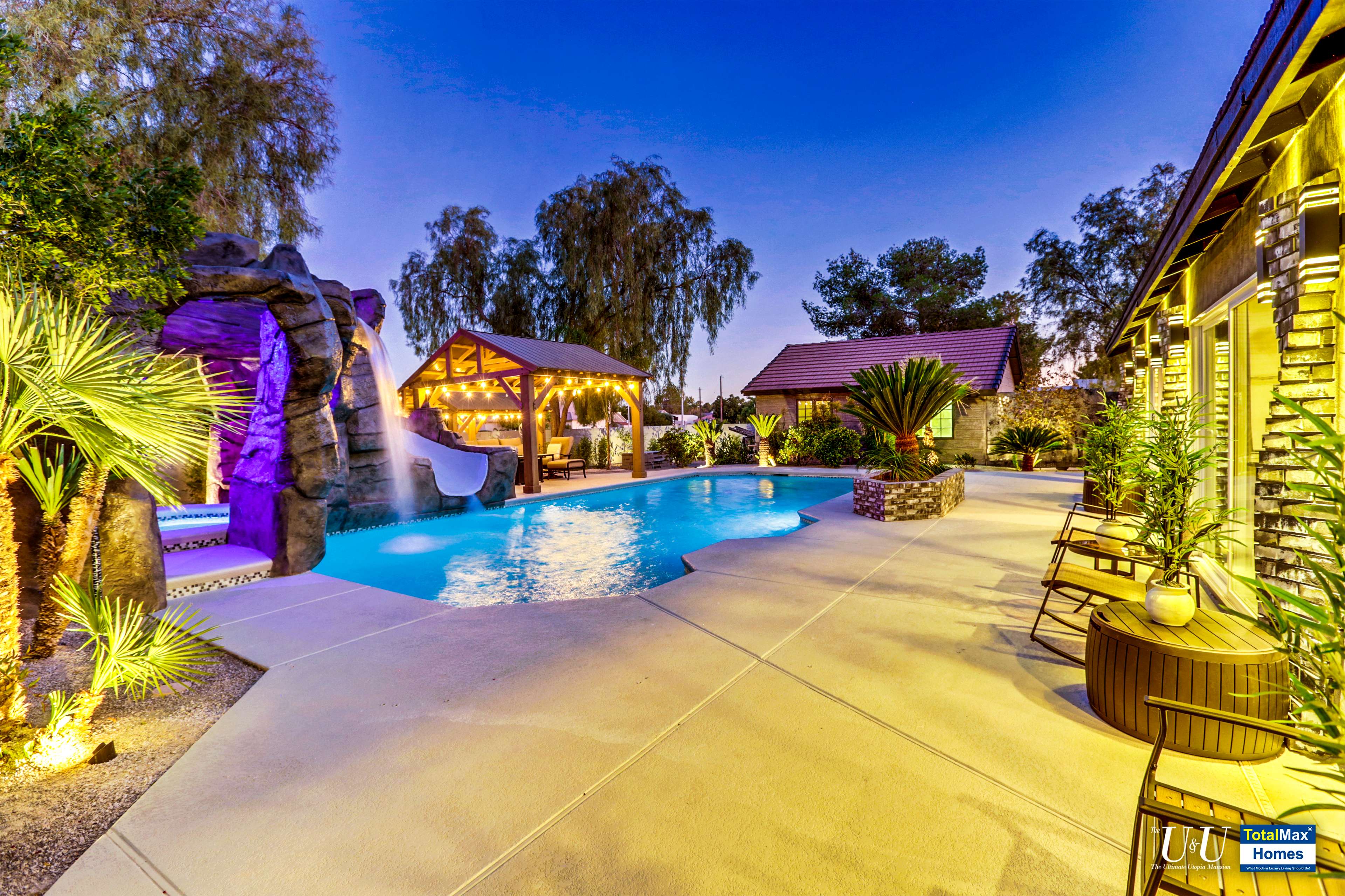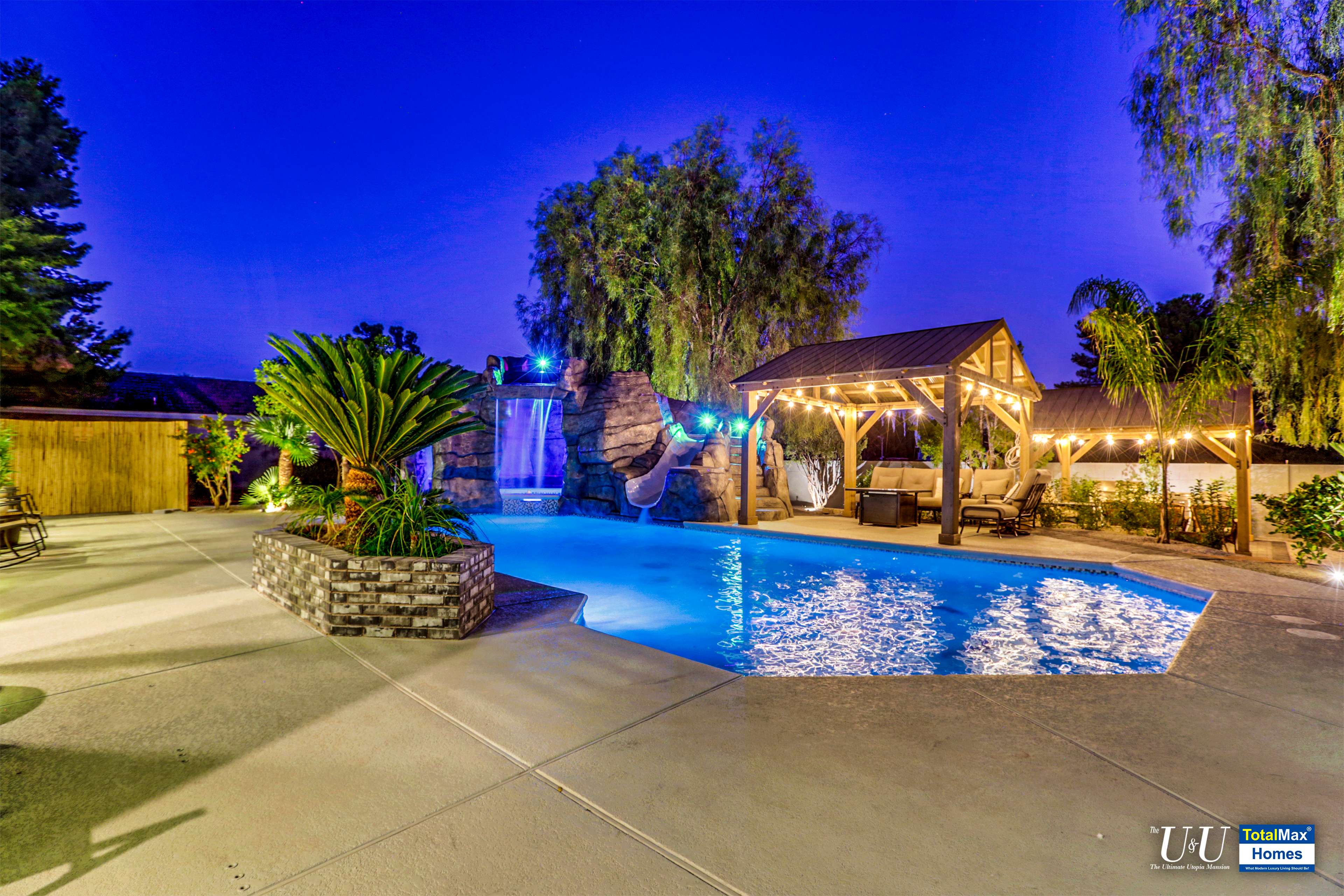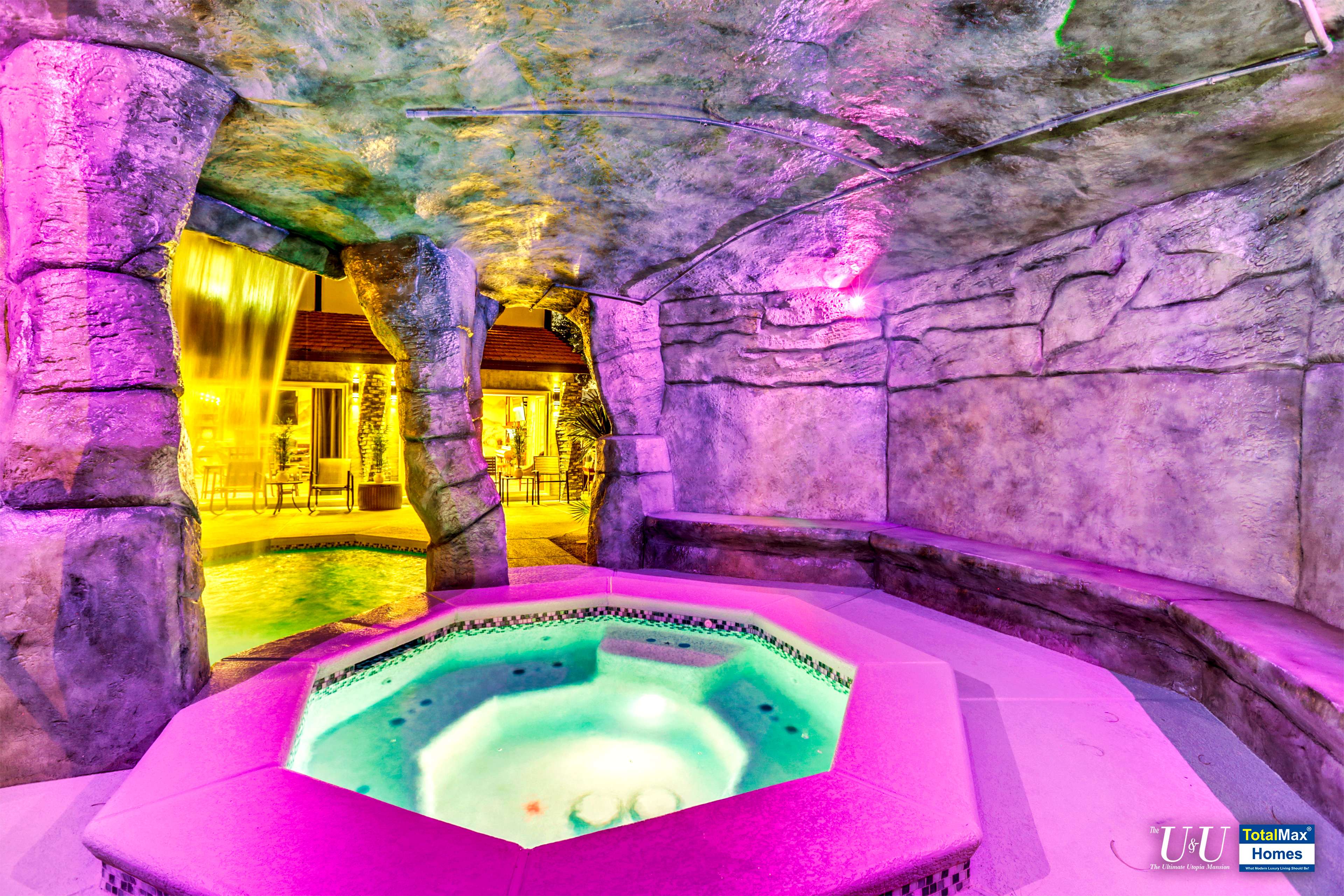 Cascading waterfall flows above the cave into the sparkling, large resort pool. Beat the heat with The O Zen swim up bar with submersible stools and table---just like you are at a 5 start beach resort pool. Fun for all: enjoy more recreation with a game of basketball. Complete outdoor kitchen, not just an Barbecue island----two burners, large hot plate, water w/sink, refrigerator, and a large barbecue stove. Connected the Spa and bamboo/palm trees lined grass backyard, comes another relaxing outdoor lounge area under a Gazebo.