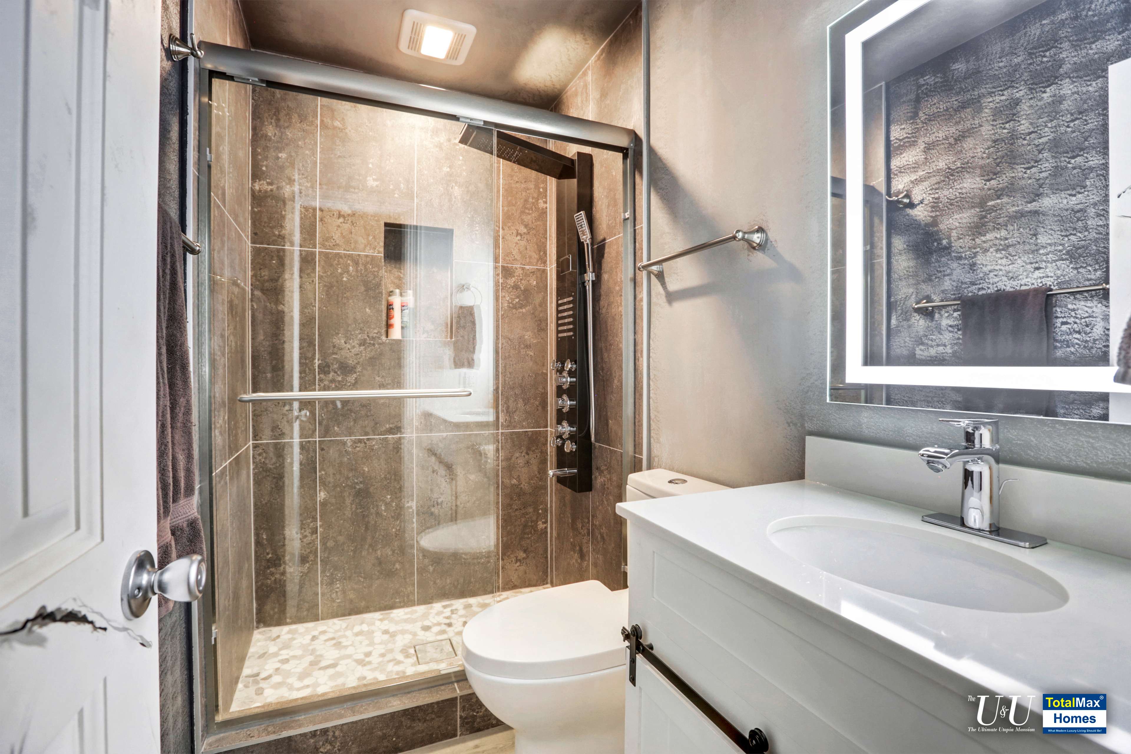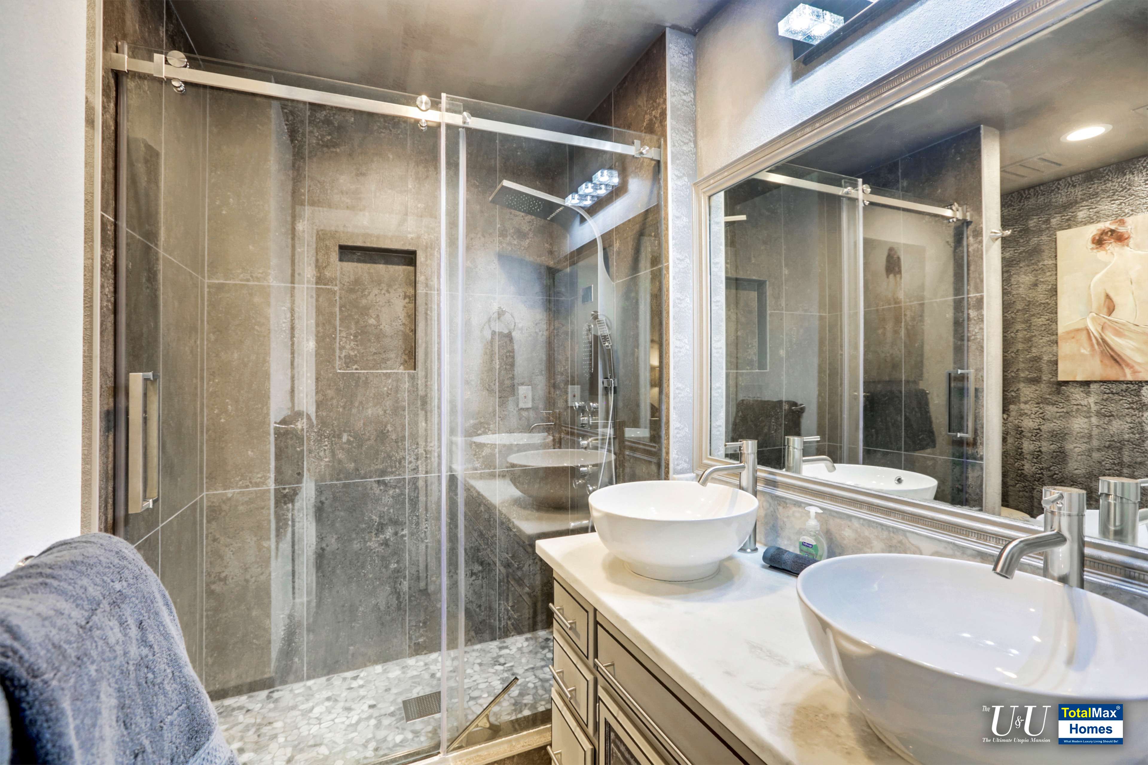 Steam shower for after swim use. Stone travertine floors and shower accent walls. Easy to use modern step-in shower stall. Modern and classy granite counters with modern sink